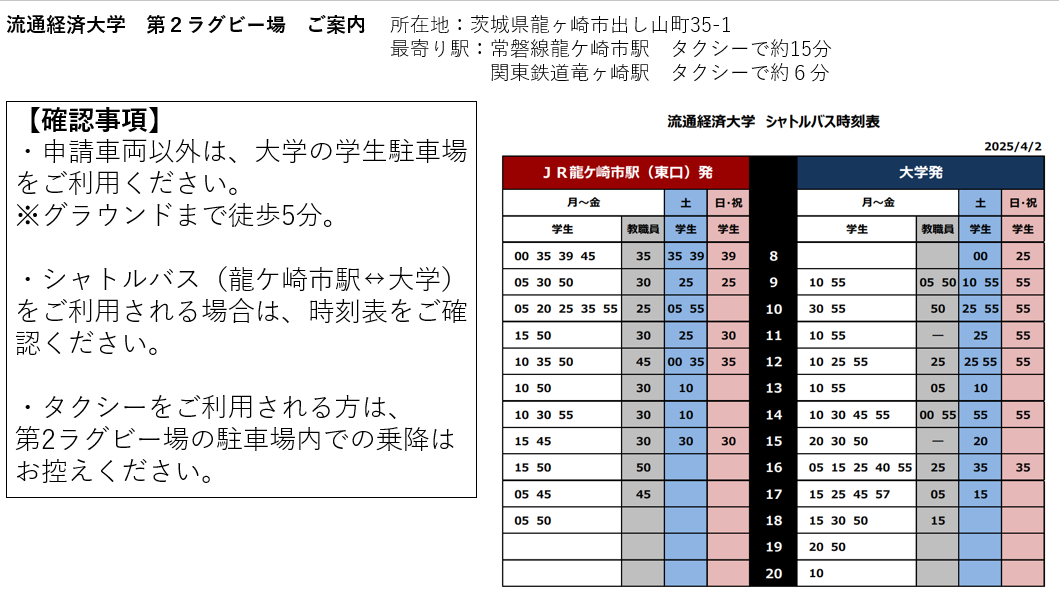 JR龍ヶ崎市駅から大学シャトルバスで10分(有料)